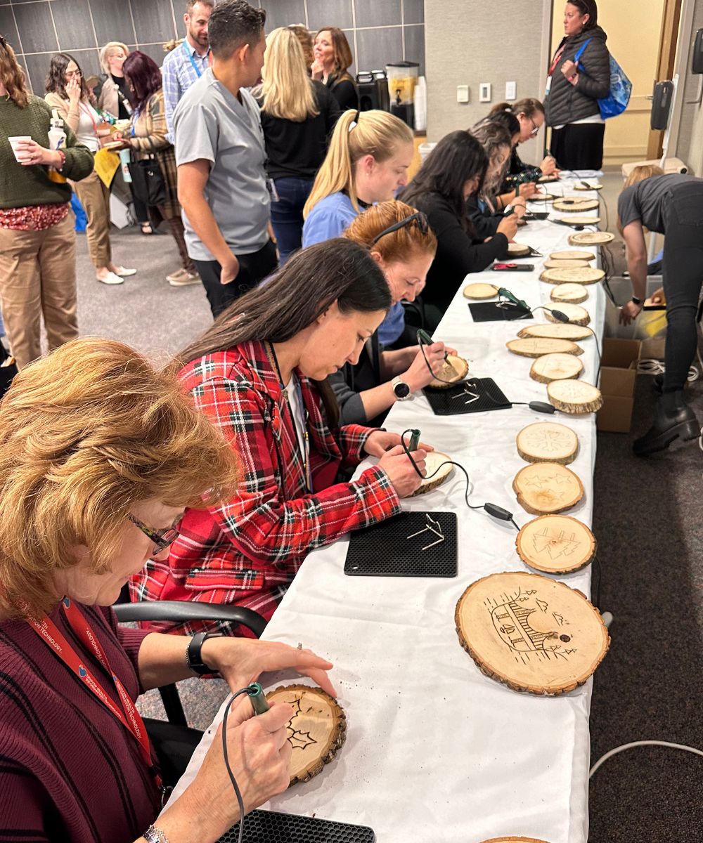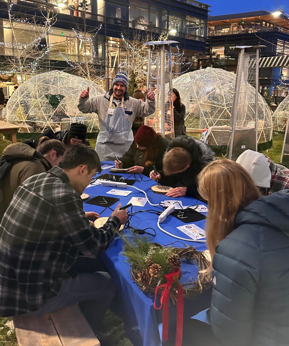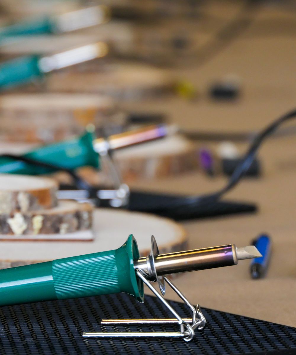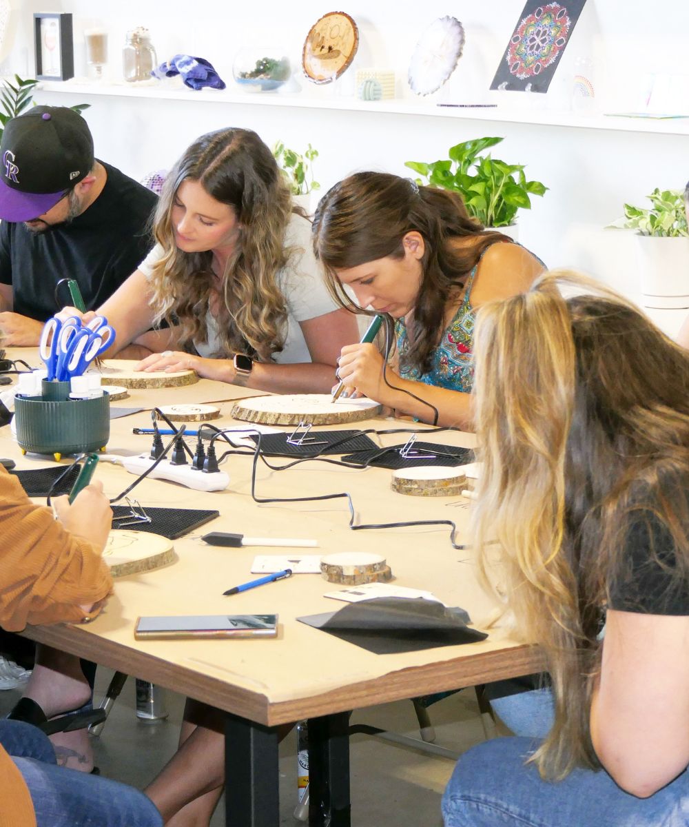 Guests burn guided designs into beautiful slices of wood, coasters, or cutting boards