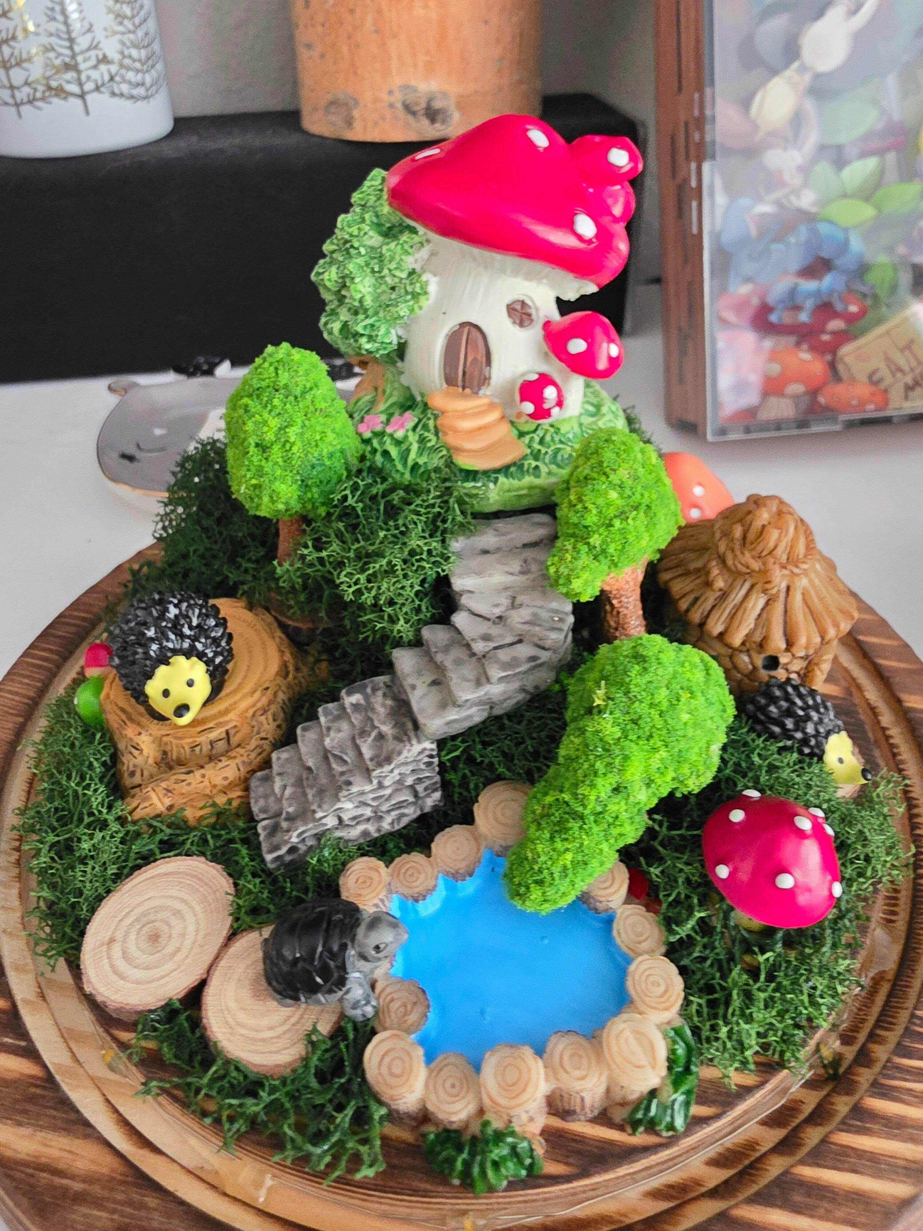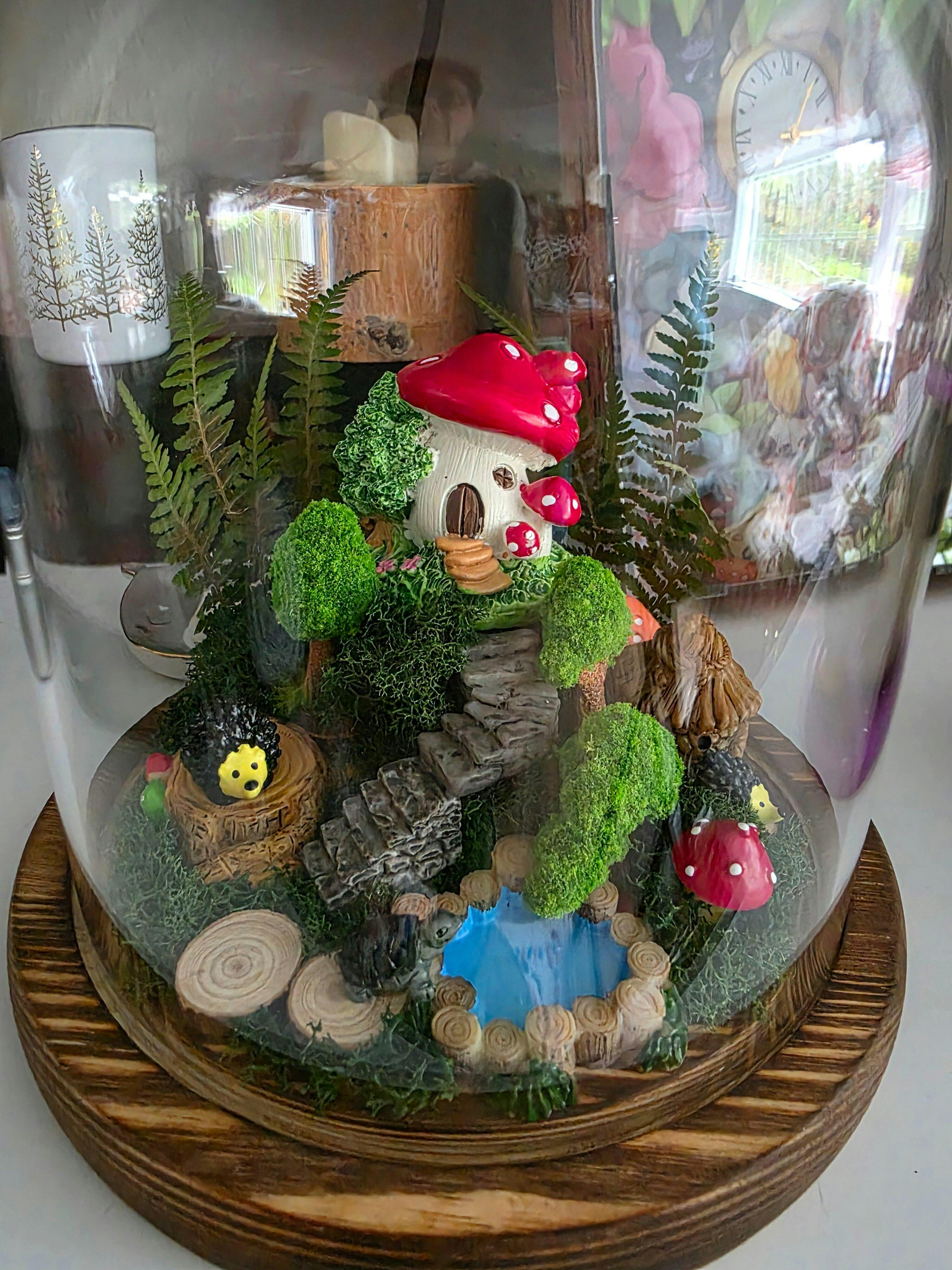 I had a lot of fun making this adorable woodland scene. I had plenty of supplies, with a few left overs, which I appreciate. My pressed ferns turned brown from the glue, but they still look fine as a backdrop glued onto the glass done behind everything inside. I did have a hedgehog fall off when tippingout to turn on the light, but nothing broke, so it's fine. I just think maybe there's a better glue option, but I'm not sure. I may have just not used enough. My glass dome has some small stress cracks or scratches which only show up with the lights on, so it's still usable. All in all, I recommend this kit. It was a fun way to spend a rainy afternoon.