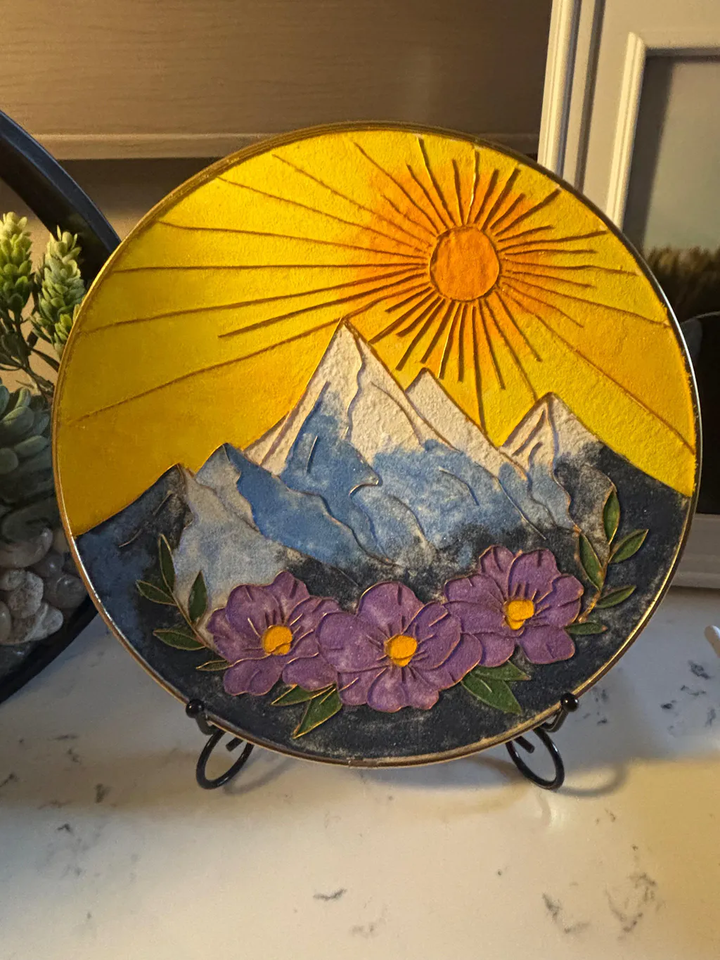 I really like how this turned out. I was impatient and had to stop and redo it, totally my fault. I kept the wood natural but it comes with paint in case you want a different background. I used my own colors to match my decor but the colors it came with are very pretty as well.