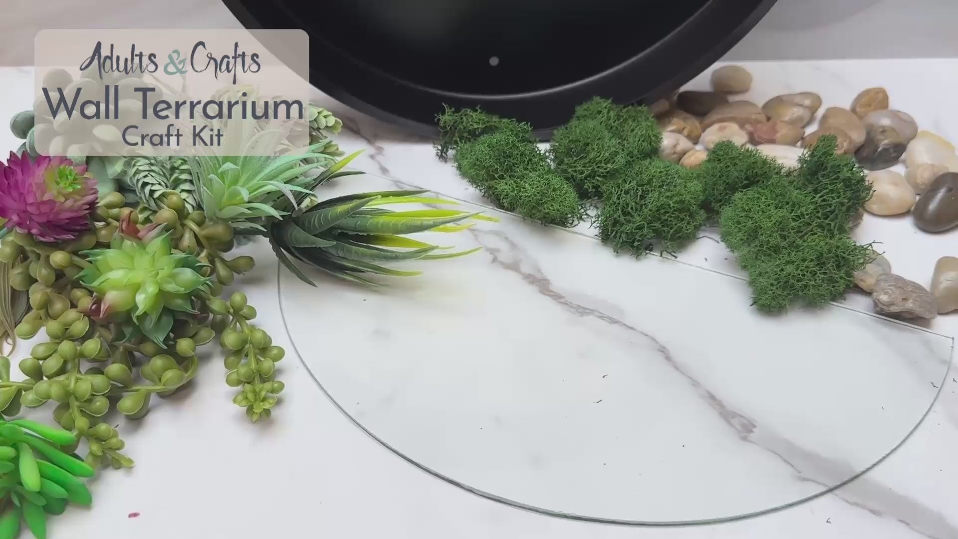 This craft kit includes a round metal wall terrarium, rocks, moss, and lifelike faux succulents. This simple and elegant planter requires minimal upkeep. Crafters may need a pencil, hammer, and screwdriver if they wish to hang the terrarium.