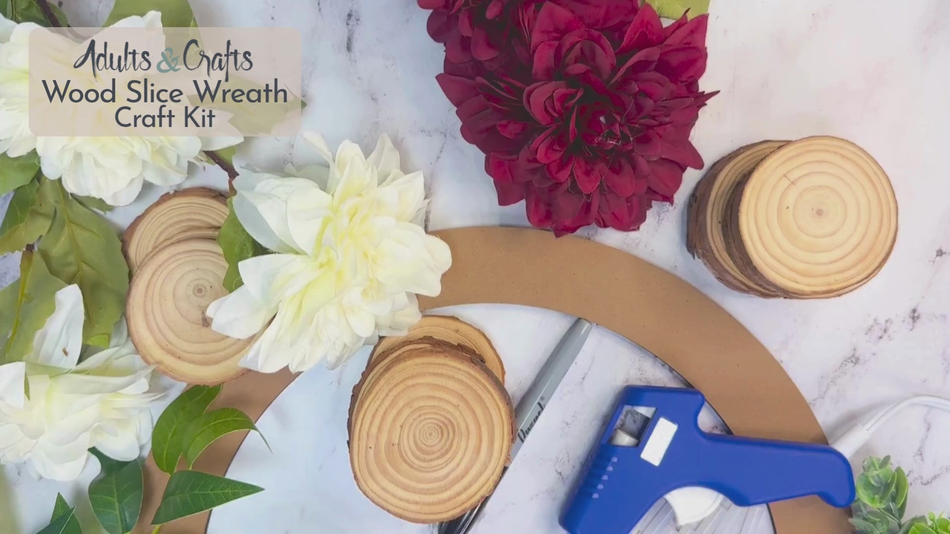 This craft kit includes a wood circle base, 26 natural wood slices, faux flower + greenery, and all the needed materials to create. Crafters will need scissors.